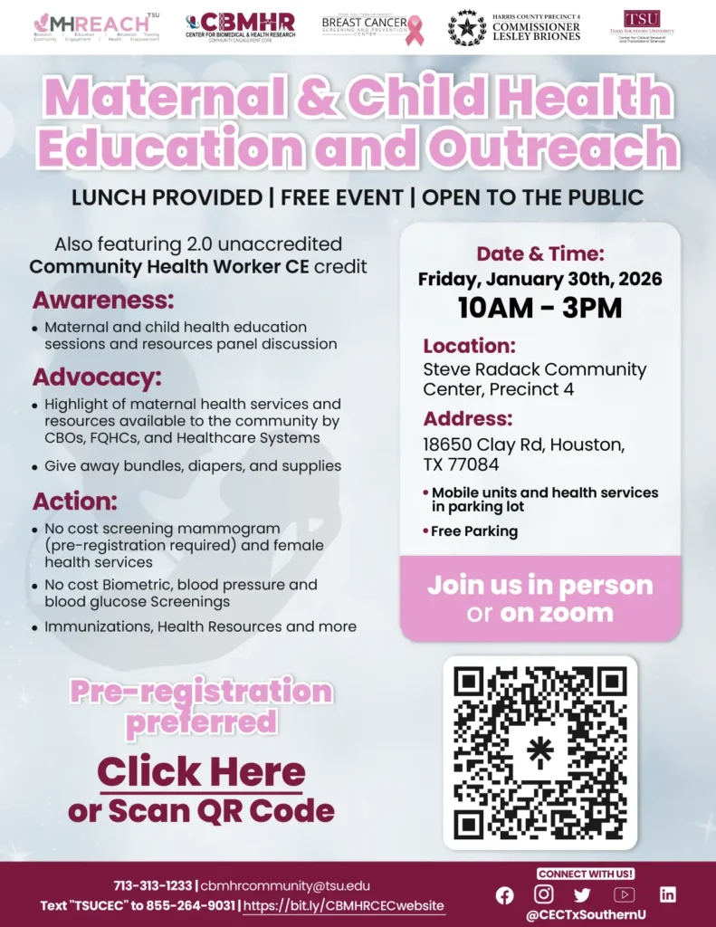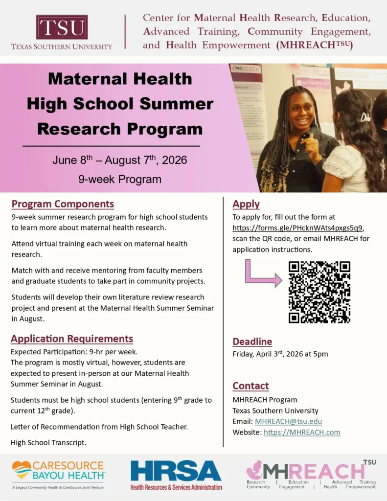 MHREACH is a maternal health center dedicated to investigating and addressing the underlying causes of maternal mortality and morbidity among at risk and highly vulnerable communities in Harris County and greater Houston area, including rural communities.